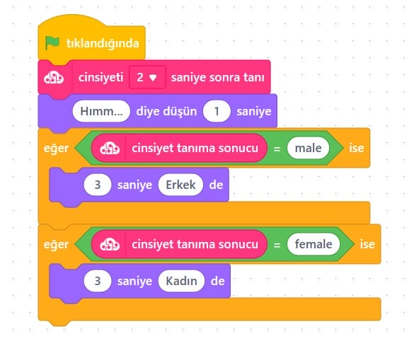 mBlock Yapay Zeka – Cinsiyet Tanıma uygulamasının blok kısmı ve blokların çalışması şu şekildedir.