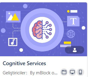 mBlock programında üstteki blok diyagramını kullanarak devremizin blok kısmını tasarlayabiliriz. Bu işlemi Kuklalar sekmesinde yapmamız gerekiyor. Kuklalar sekmesine geliyoruz. Uzantı butonuna tıklıyoruz. Bilişsel Hizmetler (Cognitive Services) uzantısını buluyoruz. Uzantının altındaki Ekle yazısına tıklayarak uzantıyı mBlock içerisine ekliyoruz. Yapacağımız uygulamalar için gerekli olan blokları, bu uzantı içerisinden bulup sahneye sürüklüyoruz.
