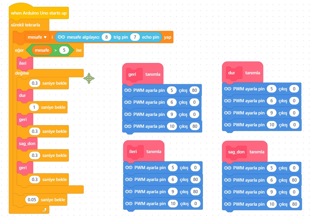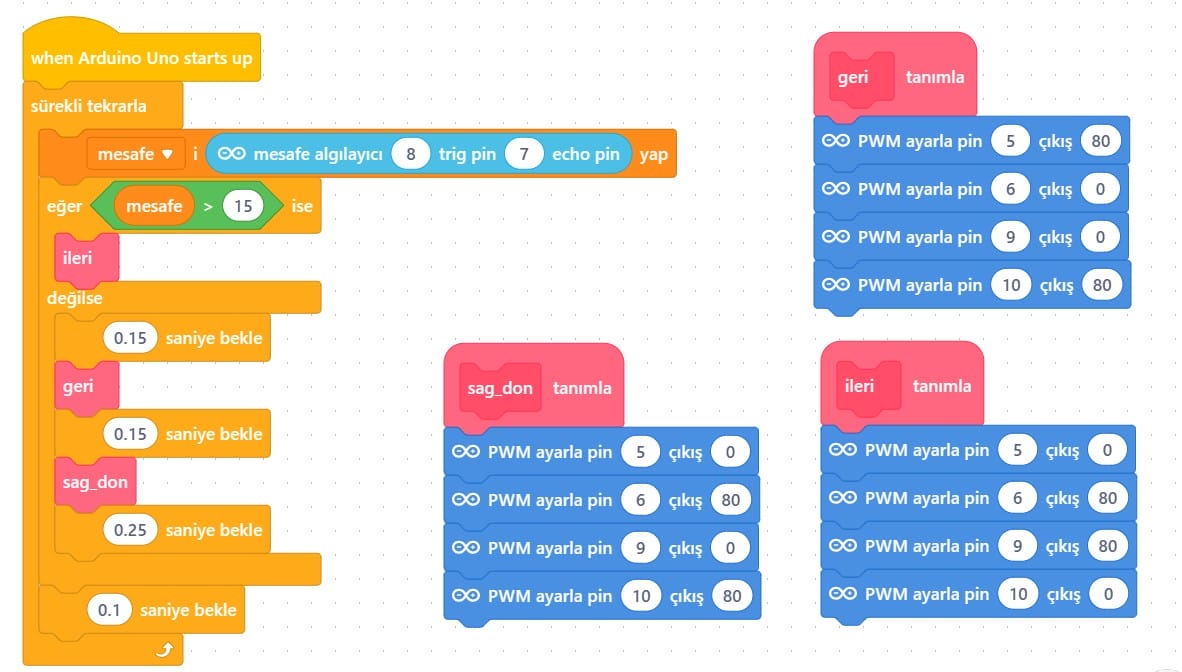 Mobil araç kiti üzerindeki güç kartına enerji verildiğinde robot 15 cm altındaki engellerde geri gelerek sağa dönecek ve yoluna devam edecektir. Eğer devreyi daha gelişmiş bir şekilde tasarlamak isterseniz aşağıdaki kod bloklarını kullanabilirsiniz.