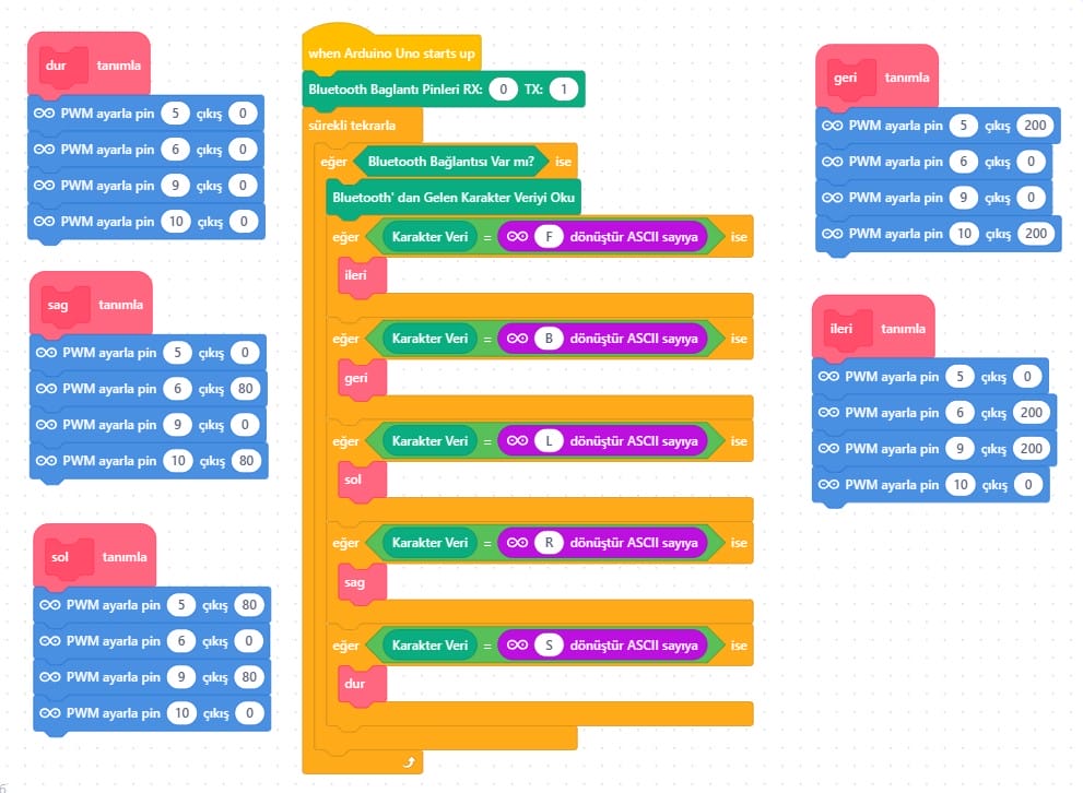 mBlock yerine Arduino kodlarını kullanmak isteyenler, aşağıdaki kod bloklarını mobil araç kartına gönderebilirler.