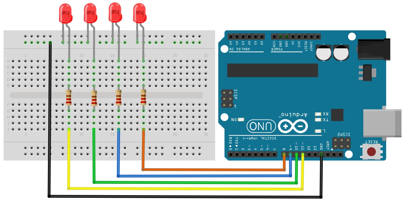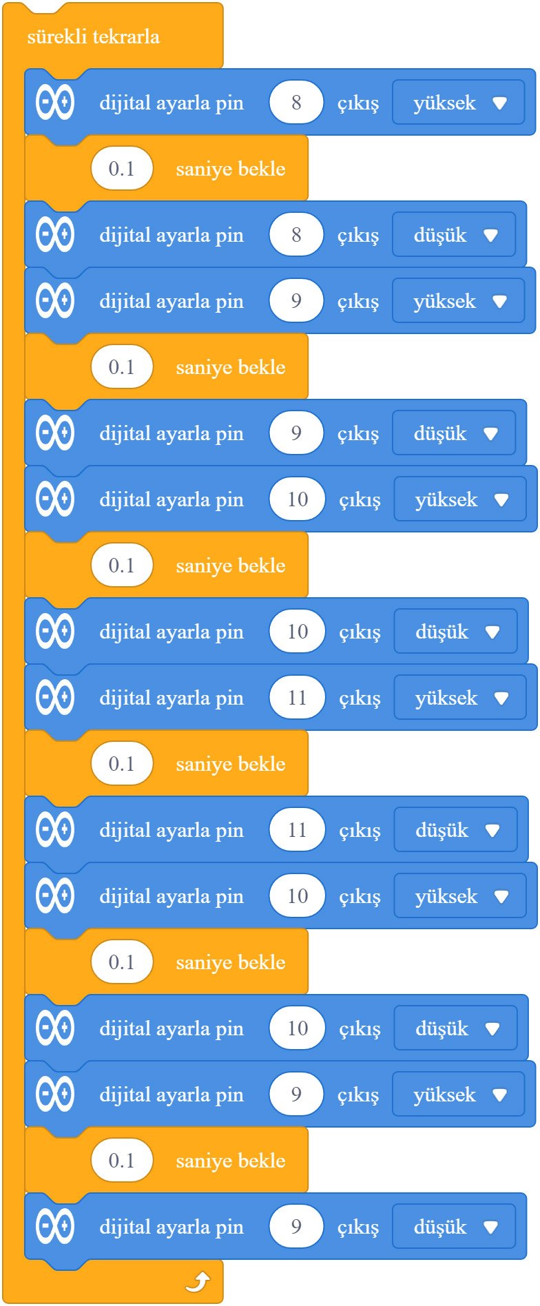 Breadboard üzerine 4 adet led diyot yerleştirilir. Dirençlerin birer uçları led diyotların uzun bacağına (+), diğer uçları da board üzerinden Arduino’nun 8 , 9, 10 ve 11. pinine bağlanır. Led diyotların (-) bacakları board üzerinde jumper kablo ile birleştirilerek Arduino’nun GND pinine tek kablo ile bağlanıp devre tamamlanır.